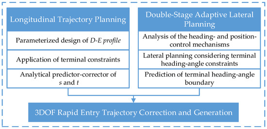 Figure 1 shows the three core modules of the entry trajectory rapid planning method. Longitudinal trajectory planning rapidly generates the D–E profile and the magnitude command of the bank angle to consider the terminal altitude, velocity, flight-path angle, time, and range constraints through the profile analytical predictor–corrector design method. Lateral planning comprises the double-stage adaptive planning algorithm based on heading adjustment and maintenance as well as the bank-reversal logic to satisfy the terminal heading and position constraints. Additionally, considering lateral large-scale maneuvers, a 3DOF entry trajectory correction and generation algorithm framework considering longitudinal and lateral coupled motion is designed, further enhancing the terminal full-state accuracy and multitask applicability of the trajectory. The specific design methods for the three modules are presented below.
