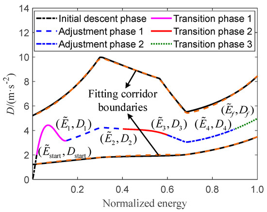 First, the upper and lower boundaries of the entry corridor should be fitted. The upper boundary of the corridor comprises the heating rate, dynamic pressure, and overload constraints, which can be fitted as a four-segment quadratic function curve , and the lower boundary of the corridor is the QEGC, which can be fitted as a double-segment quadratic function curve . The specific fitting method is discussed in reference [16]. Concurrently, the fitted corridor must be inside the original corridor to ensure the safety of the flight path.
