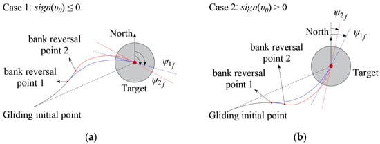 Lateral planning is aimed at controlling the lateral motion of the vehicle by designing the sign of , thereby satisfying the terminal position and heading angle constraints, which constitute the focus of this study. Reference [23] proposed a method based on the iterative design of bank-reversal points, which can satisfy the terminal heading angle constraints. However, the iterative process requires multiple numerical integrations for heading-angle prediction, and strong coupling exists between the reversal points, which decreases the convergence efficiency. Conversely, although the classic method based on the heading-angle-error corridor [6] avoids numerical integration, it cannot satisfy the terminal heading angle constraints. Thus, in this section, a double-stage adaptive planning method based on heading adjustment and maintenance is proposed for bank-reversal. This method comprises two main parts: (1) an iterative algorithm for bank reversal considering heading adjustment and (2) the design of a heading-angle-error corridor considering heading maintenance.
