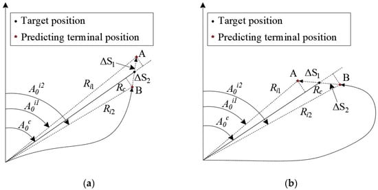 - At , two situations corresponding to Figure 6a are observed. Among them, point A represents the situation where the trajectory overshoots. According to the relative position relationship between the predicted trajectory terminal and target, it is confirmed that and < 0; conversely, regarding Point B, , and > 0, which implies = .