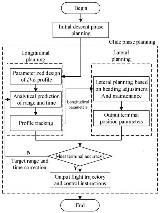 Longitudinal trajectory planning is aimed at designing a reference trajectory that satisfies the path, terminal altitude, velocity, range, flight time, and flight-path angle constraints. To achieve this, a parameterized dual-parameter D–E profile with corridor-boundary interpolation is presented in this section, and the analytical predictor–corrector of the profile parameters is designed. The analytical predictor–corrector process for the profile dual-parameter is shown in Figure 2.