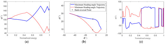 To facilitate trajectory control and tracking, the following control constraints are introduced. The control variables include attack angle and bank angle . For the bank angle, upper and lower bounds are imposed on its magnitude as follows: