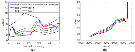 Figure 9 shows the simulation result curves corresponding to Tasks 1 to 6. Figure 9a,b show that the D–E profile is smooth, continuous, and satisfied the path constraints. Among them, Tasks 1 and 2 verified the applicability of the proposed algorithm to different range constraints. With the increase in target range, the overall D–E profile decreased, and the flight altitude increased to enhance the range capability of the vehicle, thereby achieving the task requirements. Tasks 3 and 4 further verified the control ability of the algorithm regarding the flight time under the same range conditions. Compared with Task 4, in segment k1 is smaller in Task 3 but larger in segment k2. This is because of the inverse correlation of the flight time with and velocity. Moreover, the parameter corresponds to a smaller flight velocity in the k2 adjustment segment, indicating that the time-adjustment ability in this segment is stronger. Therefore, reducing in this segment can extend the flight time.