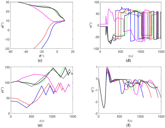 Simulation result curves under different constraints: (a) drag acceleration profile; (b) the curve of altitude–velocity; (c) the curve of ground trajectory; (d) the curve of bank angle; (e) the curve of heading angle; (f) the curve of flight-path angle.