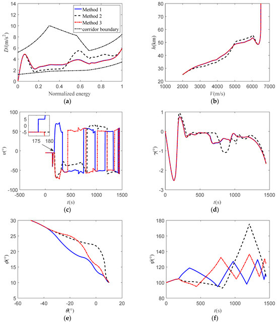 Simulation result curves under different methods: (a) drag acceleration profile; (b) the curve of altitude–velocity; (c) the curve of bank angle; (d) the curve of flight-path angle; (e) the curve of ground trajectory; (f) the curve of heading angle.