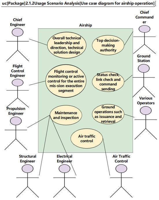 Based on the MBSE methodology, Use-Case Diagrams (UCD) are employed to describe the functional scenarios of the airship. The purpose of the UCD is to define the interaction between external actors and the system to fulfill a requirement, which will help in identifying system functionalities and how they fulfill user needs [10]. A top-level use-case view is established based on the basic functional roles of the task participants, as shown in Figure 2. The use-case diagram captures the stakeholders’ requirements for the stratospheric airship by depicting the interactions between system use cases and use-case participants (task participants).