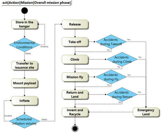 According to the overall stage division of the stratospheric airship mission, the ACT is established as shown in Figure 3. The overall mission is mainly divided into 10 stages: “Store in the hanger”, “Transfer to issuance site”, “Mount payload”, “Inflate”, “Launch”, “Take off”, “Climb”, “Mission fly”, “Return and Land”, and “Invent and Recycle”. Additionally, “Emergency landing” is considered a special mission phase. In short, the purpose of the ACT is to capture the flow of activities and control the flow between them, so an ACT is similar to a flow chart, but in some ways is more complex.