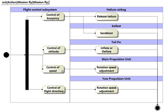 After the stratospheric airship climbs to altitude, it will begin to carry out the mission. The “Mission Fly” activity diagram is shown in Figure 4. Under normal conditions, the airship will perform various maneuvers according to the instructions obtained from the ground station. The flight control subsystem mainly controls the buoyancy, attitude, speed, and flight direction of an airship. The actuator of airship buoyancy control is helium airbag and ballast (for balance weight); the actuator of attitude control is the tail fin of the airship; the actuator of speed control is the main propulsion unit; the actuator of flight direction control is the yaw propulsion unit.