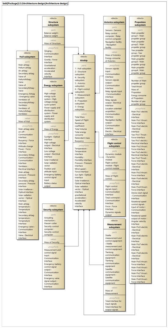 For the system-level design of the stratospheric airship, the overall composition of the system is defined by the Block Definition Diagram (BDD) [10]. The purpose of the BDD is to define the system’s structure in terms of its blocks and relationships. Based on the descriptions in the previous sections, combined with the design experience, the system architecture can be initially divided as shown in Figure 6. The stratospheric airship consists of eight subsystems: hull subsystem, structure subsystem, energy subsystem, propulsion subsystem, avionics subsystem, flight control subsystem, measurement subsystem, and security subsystem. All components of these subsystems need to be represented in the BDD. It is worth noting that the BDD establishes the high-level structure of the system, so it does not show the flow of information between the subsystems.