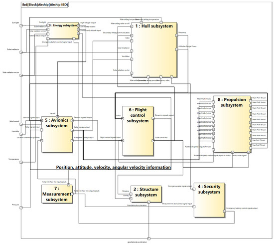 In conjunction with the airship architecture design, the internal structure of the stratospheric airship is defined through the Internal Block Diagram (IBD) [10], as shown in Figure 7. The IBD’s purpose is to detail the internal structure of a block, showing its parts, ports, and connections. Furthermore, the IBD describes the transfer of information flow among the subsystems. It added details not shown in the BDD. Combining BDD and IBD makes a more detailed description of the composition of a system.