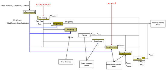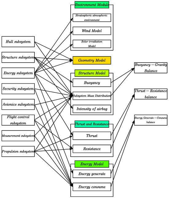 In this section, a multidisciplinary theoretical coupled simulation platform is constructed using MATLAB R2023b in conjunction with the architectural model from Section 2. The platform is designed for the airship design process and contains three equilibria: Buoyancy–Gravity equilibrium, Thrust–Drag equilibrium, and Energy Consumption equilibrium. The relevant discipline models include the environment model, geometry model, structure model, thrust and resistance model, and energy model. Figure 8 illustrates the relationship between the multidisciplinary theoretical models, the architecture design model, and the three balances.