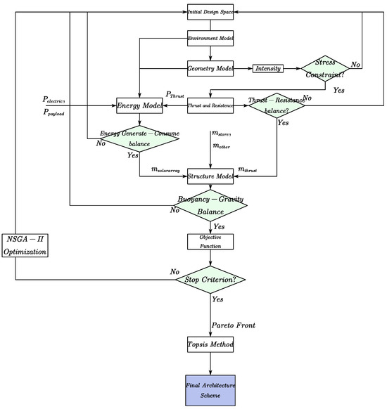 System architecture design is crucial for forward design in aerostat system engineering, yet a comprehensive research framework has been lacking. This paper presents a new method for stratospheric airship architecture preliminary design and optimization trade-off, grounded in Model-Based Systems Engineering (MBSE) theory. Firstly, a requirement analysis for a stratospheric airship is conducted using SysML, leading to the analysis and acquisition of the airship’s mission architecture design. Additionally, a multidisciplinary coupling simulation platform is developed with MATLAB, and the architecture preliminary design’s Pareto front is derived using the NSGA-II algorithm. Finally, based on the Pareto optimization set, the TOPSIS algorithm is applied to derive the optimal architecture preliminary design scheme for the airship. The optimization results validate the accuracy of the architecture preliminary design obtained from the requirement analysis, the reliability of the multidisciplinary coupling simulation platform, and the feasibility of the optimization algorithms. This comprehensive study spans the requirement analysis to the optimal architecture scheme, providing theoretical reference and design guidance for the forward design of airship systems engineering.
