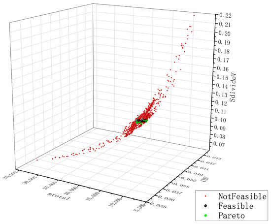 Solutions on the Pareto front often show trade-offs between different goals. A solution may excel in one goal but be slightly inferior in another, while another solution may be balanced across multiple goals. For comparison analysis, the solutions with the smallest drag coefficient, the smallest total mass, and the smallest airship area–volume ratio were selected from the Pareto front in Figure 15.