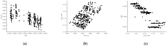 Plot (a) of Figure 17 describes the correlation coefficient of the airship area–volume ratio, , in which the correlation coefficient of the airship slenderness ratio is 0.51, indicating a moderate positive correlation. The correlation coefficient of airship length is −0.34, showing a weak negative correlation. The correlation coefficient of other parameters is less than 0.2, indicating no significant correlation. Among all the parameters, is the largest in absolute value. When considering the of airships, the design of should be given the highest priority. In this way, and should be designed subsequently because their correlation coefficient absolute values are secondary. Another parameter’s correlation coefficient is too small to influence the value of the airship in a certain way.