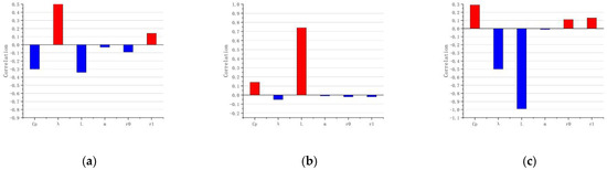 Plot (c) of Figure 17 describes the correlation coefficient of the drag coefficient, , where the correlation coefficient of airship length is −0.99, indicating a high negative correlation. The correlation coefficient of the slenderness ratio is −0.5, showing a moderate negative correlation. The correlation coefficient of the prismatic coefficient is 0.29, indicating a weak positive correlation. The correlation coefficient of other parameters is less than 0.2, indicating no significant correlation. It is not hard to see that the correlation coefficient of has the largest absolute value and is secondary among all the parameters. Therefore, when considering , the design of should be given the highest priority and λ should be given the secondary priority. Furthermore, the correlation coefficient of is 0.29, which means that the change of ’s value can influence the value of in a low degree. cannot be ignored, although the influence degree of is low. Another parameter’s correlation coefficient is too small to influence the value of in a certain way, so they could be ignored when considering the drag coefficient.