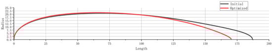 The comparison of the smallest drag coefficient is shown in Figure 18, and the data for the comparison is shown in Table 6. When the drag coefficient is lowest, the , , and of the airship become larger, while , , and become smaller. At the same time, the total mass and area–volume ratio of the airship are reduced simultaneously.