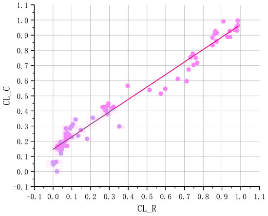 The relative closeness of the obtained cost, , and reliability, , is constructed as a binary graph and the curve is fitted with logarithmic data points. Visualization of the solution space, as shown in Figure 20, assists the designer in determining weight combinations. The fitted linear curve is and the coefficient of determination is 0.96473. The fitting curve shows that cost, , is positively correlated with reliability, , in the range of weight combination selection.