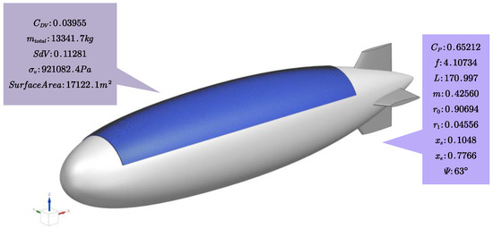 The comparison of the airship type with the smallest area–volume ratio is shown in Figure 20, and the data for the comparison is shown in Table 8. When the area–volume ratio of the airship is minimized, the , , , and of the airship decrease and and increase. The total mass of the airship decreases, and the drag coefficient increases.