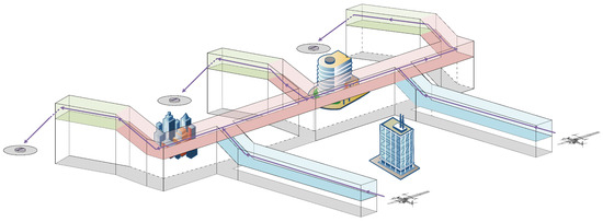The urban air mobility route network is designed using the ‘ground road network’ as a model, with three-dimensional routes forming the basis for planning, as illustrated in Figure 1. Aircrafts take off and land at vertical take-off and landing sites, proceeding to the next site through the route network while adhering to predetermined flight regulations within the routes [15]. The urban air traffic management system, developed following this framework, focuses on planning the route network and establishing internal regulations within the routes to effectively oversee aerial vehicles.