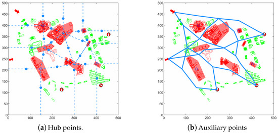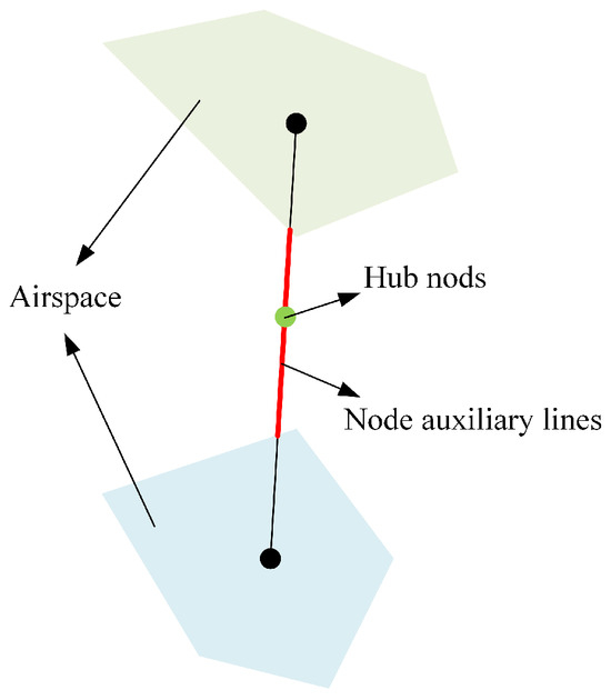 Identification of hub nodes: Following the intersections between the connecting lines generated from handling the airspace environment and the flight paths, the auxiliary points are processed. The auxiliary points that lie on the same auxiliary line are clustered [26,27], and hub nodes are determined.