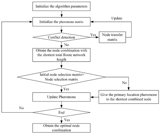 The global optimization method for the urban air mobility route network, which is based on node movement, represents an enhanced approach derived from the ant colony algorithm to globally optimize route networks. The distinct steps involved in this process are outlined in Figure 6.
