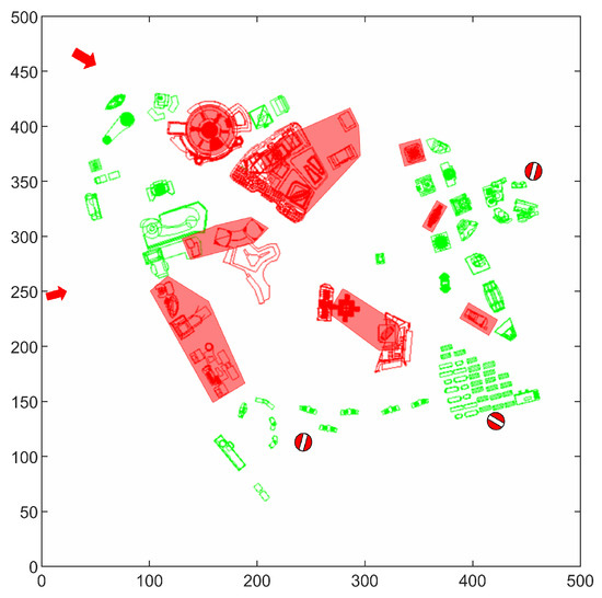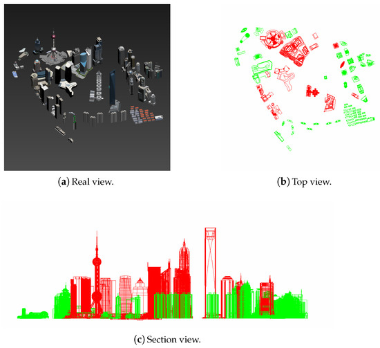 This study selects a specific area in Shanghai as the environment for simulation experiments in Figure 7. This area is characterized by a high concentration of tall buildings, making it well-suited for simulating no-fly zones. During the experiment, the altitude of the air route network is set at 200 m, with a safety margin of 20 m. This designates buildings with a height of 180 m or above as no-fly zones. In the diagram below, red buildings represent areas with heights exceeding the specified limit, while green buildings represent areas that meet the safety flying requirements.