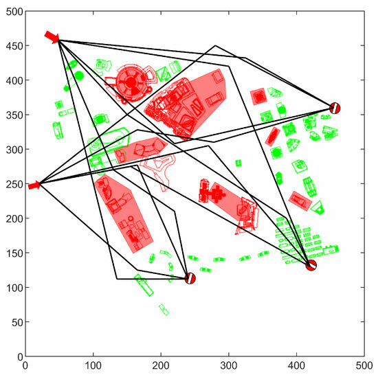 In the formula above, represents any two nodes, P represents the set of nodes, and represents the coordinates of any point on route segment . In this paper, the restricted flight areas are denoted by the set Z, and all points within this set signify areas that are prohibited from being traversed.