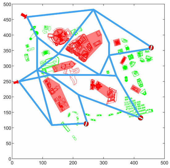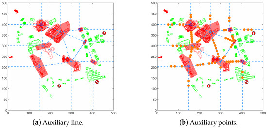 To process the airspace environment as described in the second section, blue auxiliary lines and orange auxiliary points are generated, as shown in Figure 10.