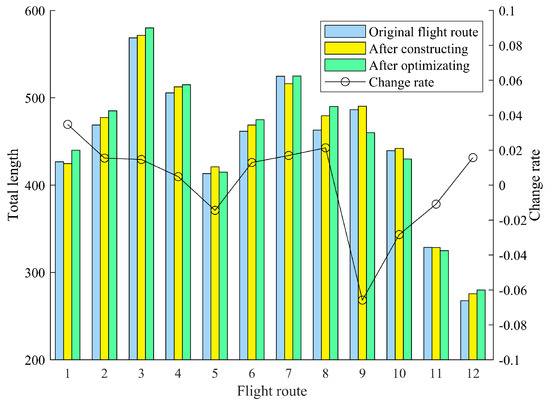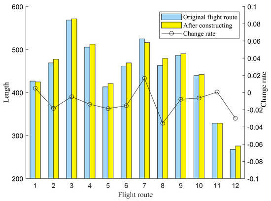 Based on the experimental results mentioned above, it is evident that this approach can effectively establish a route network based on pre-planned flight paths. In addition, the initial lengths of the 12 routes were compared with their lengths after the route network was constructed, and the magnitude of the change was calculated, as shown in Figure 12.