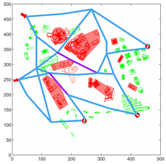 After inputting the parameters, the constructed route network was optimized, and the results are shown in Figure 13. Due to the interconnectivity of various nodes in the route network, new conflicts arose during the optimization process. Subsequently, conflict detection was performed on the optimized results, revealing conflict areas as indicated by the purple lines in the figure.