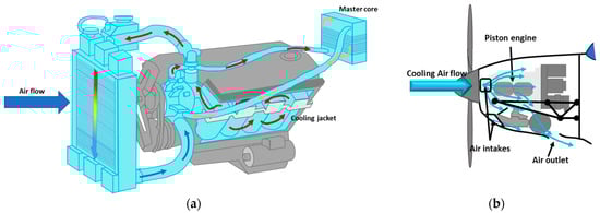 Figure 1. Typical scheme of cooling: (a) liquid cooling system for an automotive engine; (b) air cooling system for a piston engine. - Forced air cooling systems: These systems adopt the same principle as liquid cooling systems [17], using air as a coolant to transfer heat from the source to the external ambient [21]. As for liquid cooling systems, air cooling systems (see Figure 1b) have been applied to existing piston aircraft [22], even if it is less effective during low-speed operations (i.e., ground operations, take-off, holding, and all the other high-power/low-speed operations). This type of cooling is commonly used in electric motors, where air is circulated over the surface of the motor to dissipate heat. Studies explore factors influencing cooling effectiveness, such as fan design, airflow, and heatsink configurations. While ensuring construction simplicity and reduced weights, this approach cannot easily guarantee heat dissipation in the reference volumes. TRL is higher than 7.