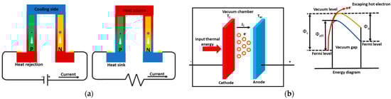 Figure 5. (a) Peltier principle (left) and Seebeck effect (right); (b) thermionic energy converter.- ○