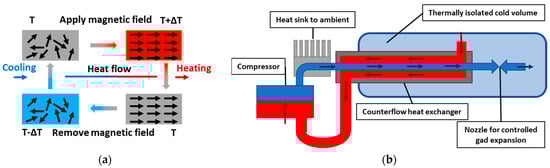 - Caloric materials: This type of materials generates cooling effects by the influence of magnetic (magnetocaloric materials), electric (electrocaloric materials), or mechanical (mechanocaloric materials) forces, using a reversible transformation. The TRL is between 2 and 3. In Figure 6a, a schematic of the principle of the magnetocaloric effect is shown.