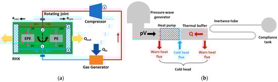 Figure 7. (a) Centrifugal RBCC; (b) thermoacoustic heat engine. - Thermoacoustic heat engines: These systems (see Figure 7b) are composed of a resonator filled with a working fluid and heat exchangers in a tube. Their geometry is studied to convert heat into small air vibrations (i.e., acoustic power). The TRL is between 1 and 3.