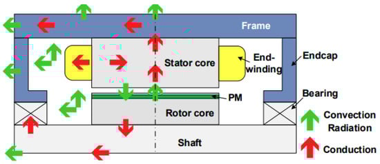 Most cooling systems are based on the physical principles of conduction, particularly convection [18,19]. Convective heat exchange is the first resource used for motor cooling. Consequently, finding strategies based solely on the conductive process is not easy. The latter methodology is based on transferring molecular energy through the molecules’ vibrational, rotational, and translational motions. But it does not exploit the macroscopic movement of matter in any way.