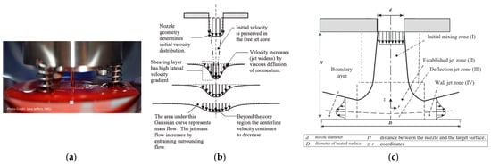 The second region is the impact region, where the interaction between the jet and the surface produces a strong flow deceleration. The fluid begins, thus, to flow in a direction parallel to the solid, forming a liquid layer that grows along the dimensions of the impact surface. This liquid “film” represents the third region in Figure 9c [50,52].