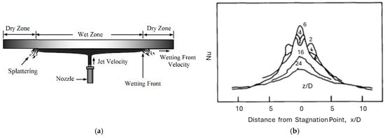 In case the regime is laminar, no “splattering” occurs [50]. The heat transfer of a jet striking a surface is expressed by the Nusselt number (Nu) and is a complex function of many parameters: