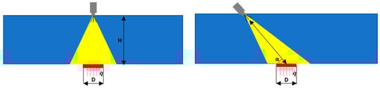 This transfer (diffusion by viscosity) momentum outward from the jet, attracting additional fluid and increasing the mass flow of the jet. During such a process, the jet loses energy, and the velocity profile widens in spatial extension, decreasing its modulus along the edges of the jet itself. The “core” of the liquid column, in general, is not affected by momentum transfer and thus forms a central zone with a higher total pressure than the rest, with a velocity along the nozzle axis (Um) almost equal to the velocity exiting the borehole (Un). The extreme points of this zone have velocities equal to 0.95∙Un and thus allow it to be distinguished from the rest of the liquid column. It may occur that shear stresses also expand towards the “core” before the jet reaches the surface. The decay of the “core” itself thus begins.