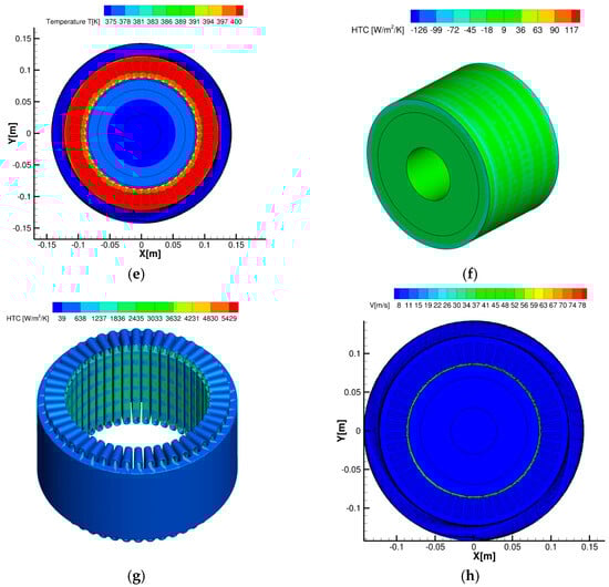 By performing the thermal analysis of the electric machine for which a simple surface finning was used for the power density of Table 4, the maximum temperature was detected at the stator windings, with temperatures rising above 800 K. The design of the TMS for the current application started with collecting global data on different cooling technologies’ power and global heat exchange coefficients. From this, it was observed that the power involved and the limited spaces were incompatible with classic cooling systems such as cooling jackets. It was therefore decided to focus on direct cooling with thermal oil, which remains liquid even at temperatures above 180 °C. Even if thermal oil has a specific heat and a density slightly lower than water, thanks to the potential of direct cooling and the effect of the impinging jets [58], a more efficient heat exchange is obtained locally and globally. Both the review of cooling techniques and the in-depth analysis of oil jet cooling have been discussed in Section 2 and Section 3, respectively.