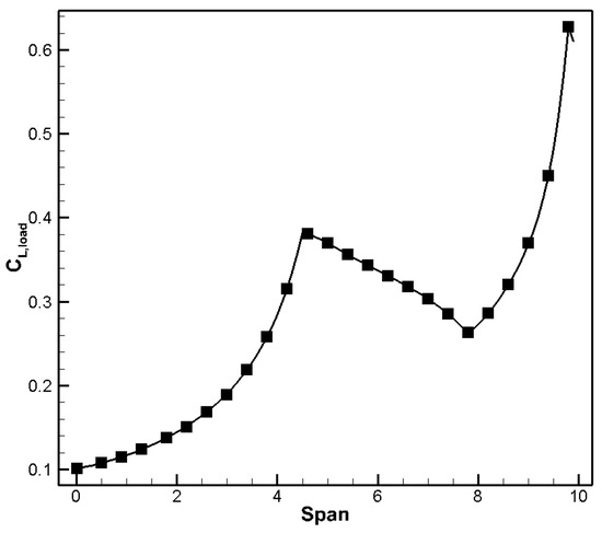 Although the thickness of the inboard position of the flying wing is large, no significant shock wave occurred due to its large sweep angle. However, the high lift of the outer wing section leads to strong shock waves in the middle area of the flying wing, spanning the entire outboard wing and extending to the wing tip. The difference in the local chord length of various positions results in a gradual reduction in the local load from the inboard wing to the outboard, as shown in Figure 4, presenting an approximate triangular distribution, which reflects the balance between shock drag and induced drag.