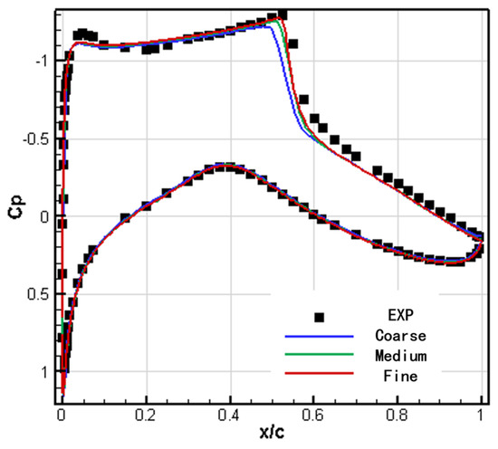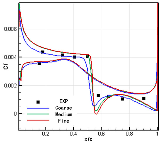 Figure 6 shows a comparison between the pressure distribution of the RAE2822 airfoil numerical calculation and the wind tunnel test results. The calculation results using medium and fine grids are in good agreement with the test results and could accurately calculate the position and intensity of the shock wave. However, the shock wave position calculated using coarse grids is higher and the shock wave intensity is weaker. Figure 7 shows the comparison between the calculated friction distribution of the RAE2822 airfoil and the experimental results. The friction distribution of the three grid calculations is in good agreement with the experimental data, but there is a certain deviation at the shock wave. Table 5 presents a comparison between the numerical calculation and the wind tunnel test results. The lift and drag coefficients calculated using medium and fine grids have high simulation accuracy.