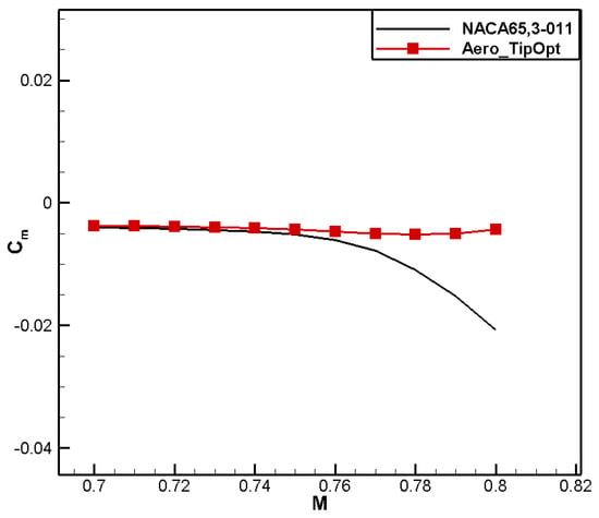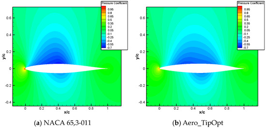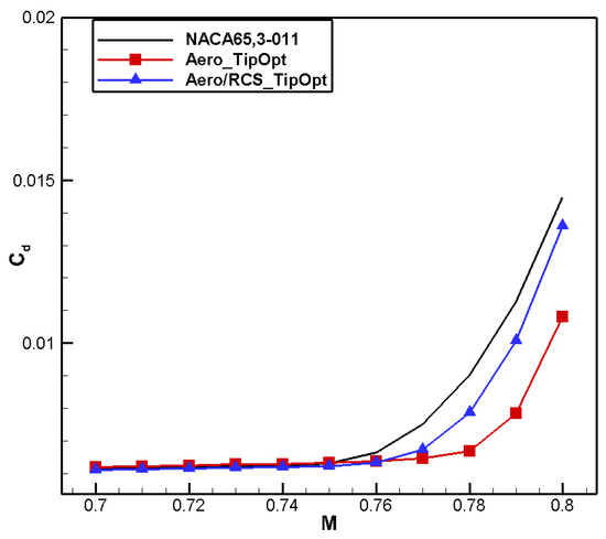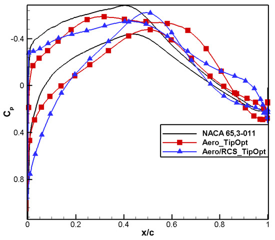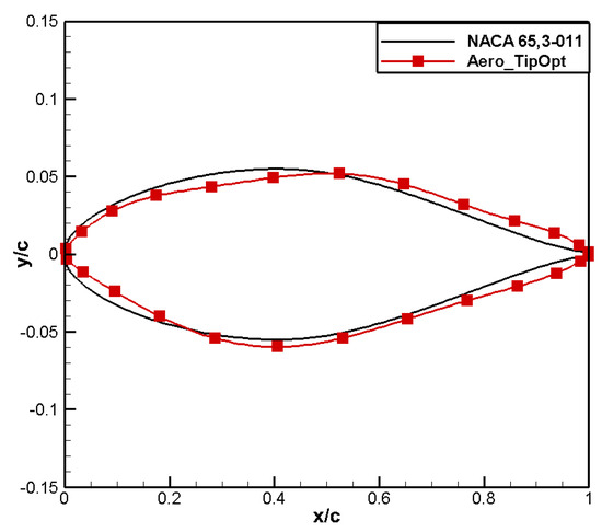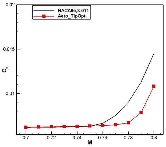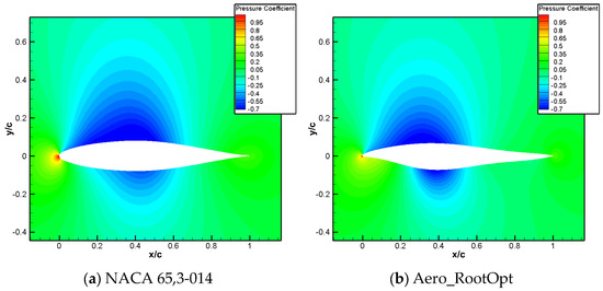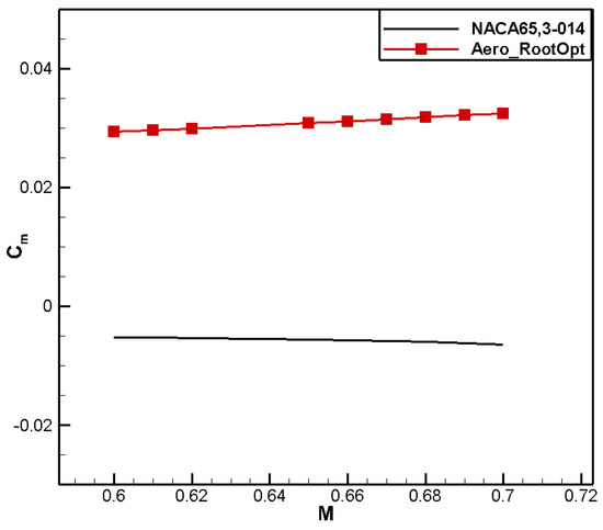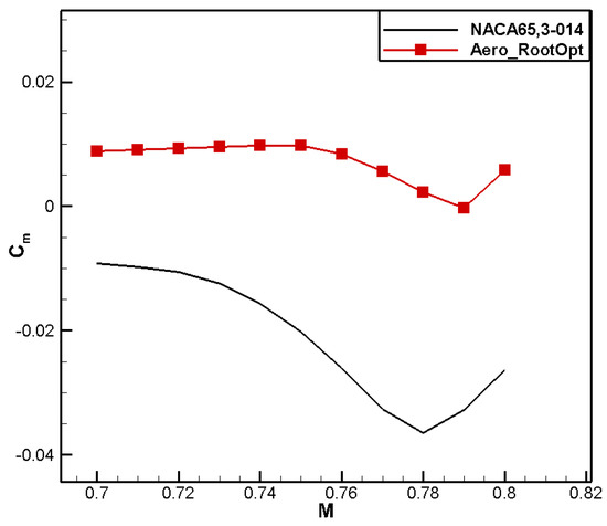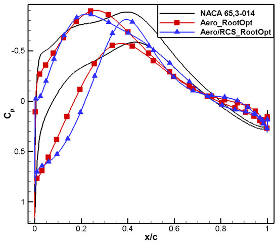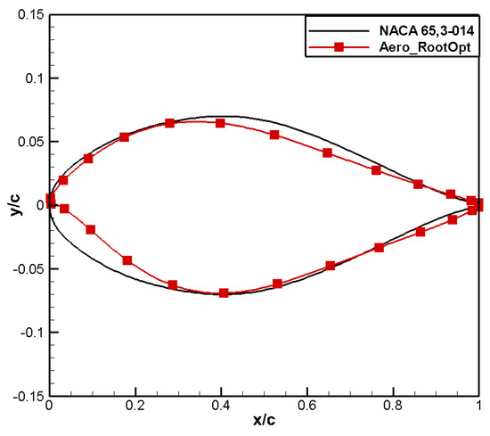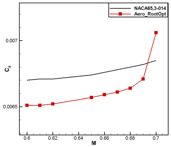 A comparison of the computational results is shown in Table 6. Compared to the baseline airfoil NACA 65,3-014, the drag coefficient of the designed airfoil, named Aero_RootOpt, reduced by 2 counts, and the moment coefficient reached 0.0308, meeting the constraint.