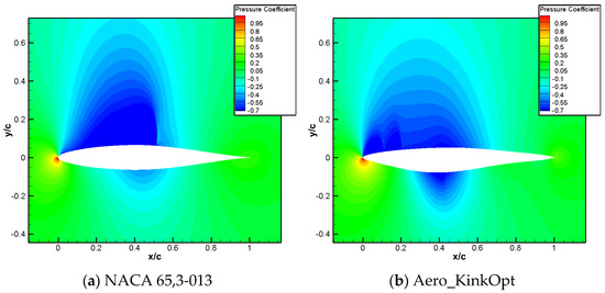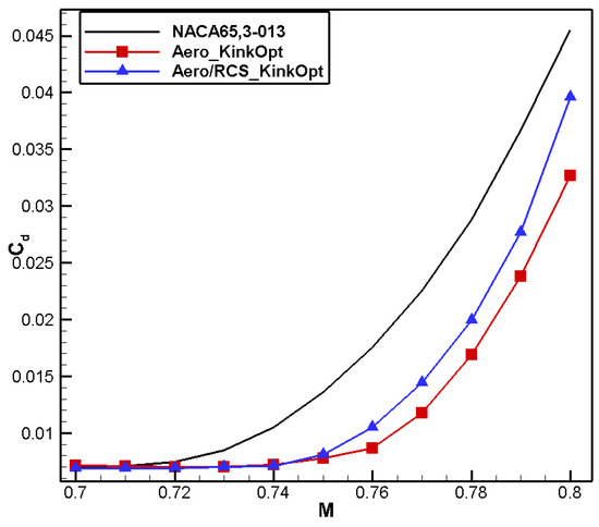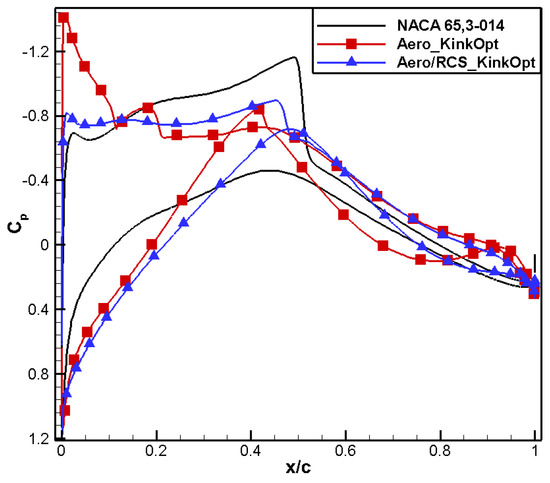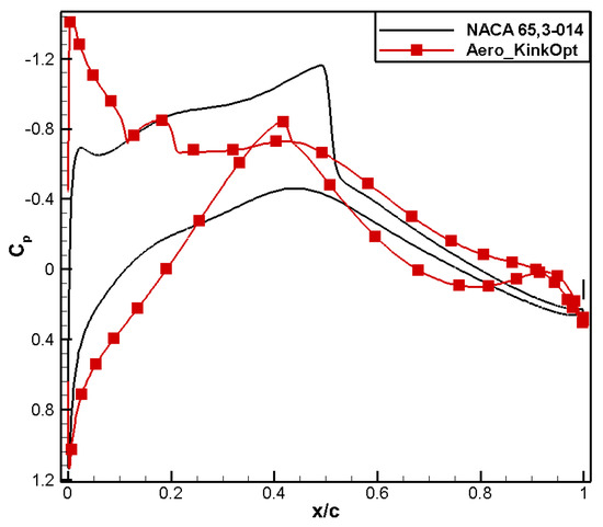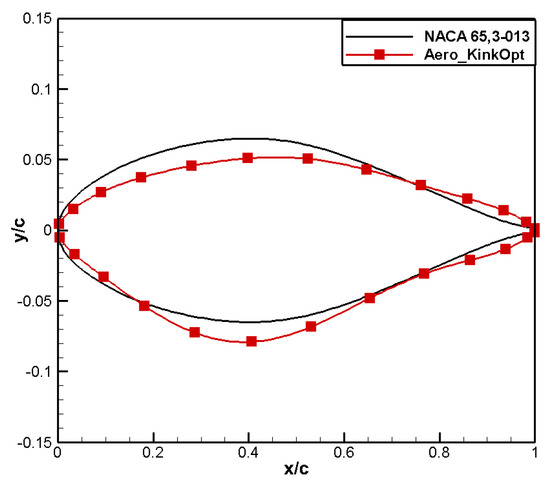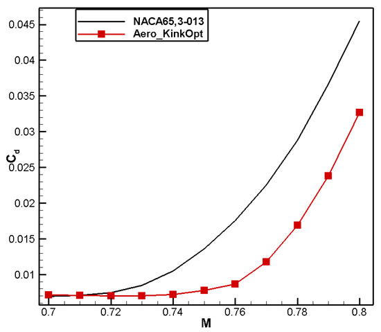 The comparison of computational results is shown in Table 8. Compared to the baseline airfoil NACA 65,3-013, the drag coefficient of the optimized airfoil, named Aero_KinkOpt, is reduced by 16 counts and the moment coefficient reaches 0.0100, meeting the design constraint.