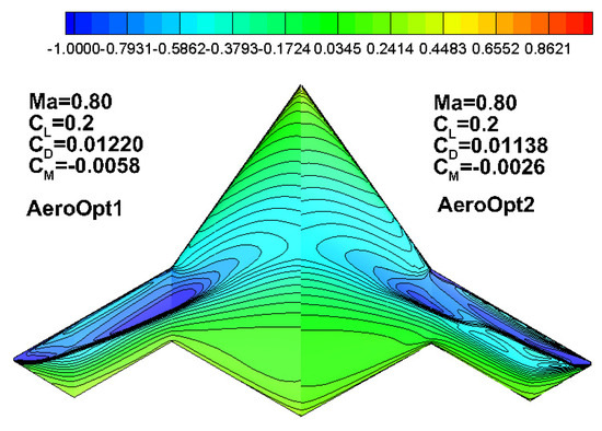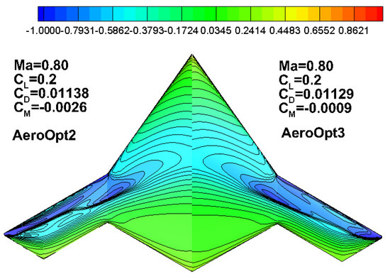 Aero_RootOpt is assembled onto the central body of the X-47B to form the layout AeroOpt1, and Table 7 shows a comparison of the computational results. Compared to BaseModel, the drag coefficient for aeroOpt1 reduced by 7.8 counts, and the pitch moment coefficient increases from −0.0192 to −0.0058. Figure 13 presents a comparison of the pressure distribution contours. Compared to the BaseModel, the low-pressure zone on the inboard wing for aeroOpt1 expands forward, and the pressure recovery at the trailing edge becomes more gentle. The shock drag on the middle wing area is significantly reduced; however, a strong shock wave still occurs on the outboard wing.