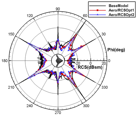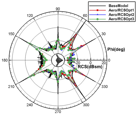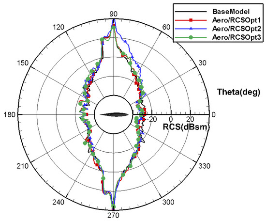 Table 17 provides the airfoil plan for all layouts, and the calculation results are shown in Table 18 and Table 19. Compared to Aero/RCSOpt1, the aerodynamic and stealth characteristics for aero/RCSOpt2 significantly improve at the current state: the drag coefficient at the design point reduces by 6.6 counts and the moment coefficient decreases from −0.0058 to −0.0022, further improving the pitch moment trimming characteristics. In addition, the average RCS is decreased by −1.593 in the pitch direction and −1.8555 in the yaw direction. Compared to AeroOpt2, the drag coefficient for aero/RCSOpt2 is increased by 3 counts, resulting in a loss of lift–drag characteristics. Figure 42 shows that the shock wave intensity in the middle region and outboard wing for aero/RCSOpt2 is weakened, and the shock wave position in the outboard wing moves forward and the pressure recovery at the trailing edge is much gentler. The average RCS decreases by −1.3382 in the pitch direction and −4.408 in the yaw direction, resulting in a significant improvement in the RCS characteristics, as shown in Figure 43 and Figure 44.