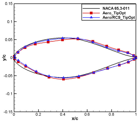 Comparison of airfoil shape for aero/stealth tip airfoil.
