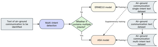 This study proposes a hybrid detection method for multi-intent recognition in air–ground communication text. First, multi-intent detection technology is used to determine if the air–ground communication text contains multiple intents. If the text includes multiple intents, the multi-intent recognition model ASA is used; otherwise, the single-intent recognition model ERNIE 3.0 is used. The ERNIE 3.0 model is trained using the single-intent text dataset, while the ASA model is trained using the multi-intent text dataset. Due to the relative scarcity of multi-intent text data, the single-intent text dataset is used as a supplement. The specific process is illustrated in Figure 1.