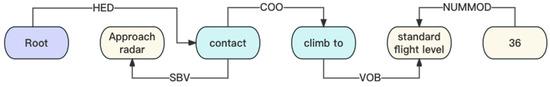 In multi-intent detection tasks, this study should pay special attention to whether air–ground communication texts contain coordinate relationships (COO). When the sentence structure contains COO, it indicates that the sentence contains multiple entities or actions, which implies multiple intents. For example, consider the following air–ground communication text: “CCA8891, Approach radar contact, climb to standard flight level 36”. Here, the recipient’s call sign is “CCA8891”, and the communication content is “approach radar contact, climb to standard flight level 36”. In this context, “approach radar contact” indicates that the controller informs the pilot that they have been identified by the radar, forming a subject–verb relationship, where “approach radar” is the subject and “contact” is the verb. “climb to standard flight level 36” represents a verb–object relationship, with “climb to” being another parallel verb, “standard flight level” as the object, and “36” as a numeric modifying “standard flight level”. Analyzing the communication content of this text reveals the presence of coordinate relationships in the sentence, indicating the concurrent occurrence of multiple actions and, thus, multiple intents. Figure 2 depicts the DP structure for this example, and Table 1 details the relationships within it.