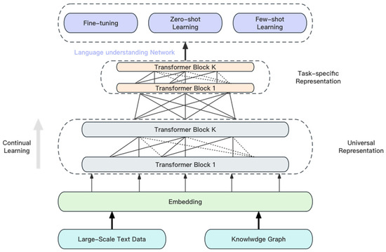 Single intent recognition requires selecting the correct category from multiple possible intent categories, making it a typical multi-class classification problem. In this study, the ERNIE 3.0 model is used to classify single intents in air–ground communication texts. ERNIE 3.0 [29] is a large pre-trained language model in the ERNIE series proposed by Baidu. These models are based on the transformer architecture and have been pre-trained on large-scale corpora, resulting in a strong semantic understanding and representation learning capabilities. Conventional large-scale pre-trained language models have demonstrated relatively poor performance in downstream language understanding tasks. To address this issue, the ERNIE 3.0 model integrates the advantages of autoregressive networks and autoencoding networks. This allows trained models to quickly adapt to zero-shot, few-shot, or fine-tuning scenarios in natural language understanding and text generation tasks. Additionally, the ERNIE 3.0 model incorporates knowledge graph data during the pre-training phase. The architecture of the model is illustrated in Figure 3 [29].