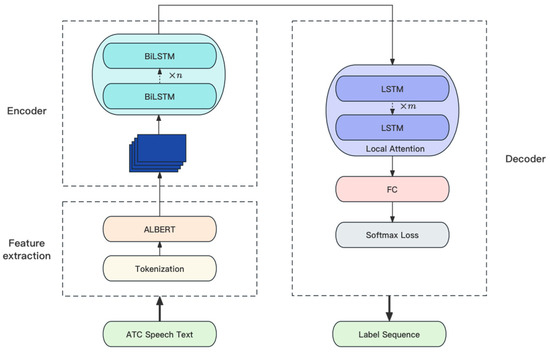 Multi-intent recognition requires simultaneously identifying multiple possible intent categories, meaning a single input text may correspond to multiple intent labels, making it a multi-label classification problem. In this study, we propose an ASA model to address the multi-intent recognition problem. This model starts with the original air–ground communication text input, tokenizes it to split it into a series of token units, and then uses the ALBERT model to convert these token units into embedding vectors. Through multiple layers of transformer layers, deep semantic features of the text are extracted. Subsequently, the text features are fed into the encoder, where a series of BiLSTM layers further encode the ALBERT-output features, capturing the sequence’s contextual dependencies. The decoder’s LSTM layer processes information from the encoder, and a local attention mechanism allows the model to focus on the most relevant parts of the input sequence during output generation. The output of the decoder passes through a fully connected layer, which serves as the classifier. Finally, the output of the fully connected layer is processed using the SoftMax function to determine the probability distribution of each possible output, resulting in the label sequence. The structural diagram of the model is shown in Figure 4.